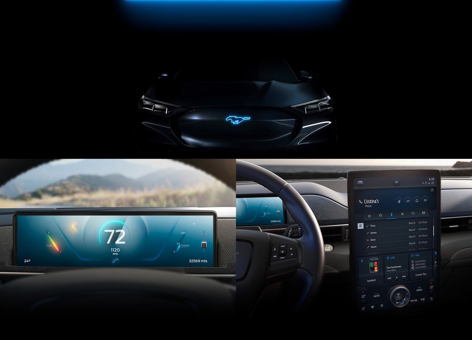 The user interface concepts for Ford Mach-e and Byton M-Byte car dashboards are designed with a focus on combining intuitive controls and Tesla "welcome" logo intro animation sleek graphics to create an immersive driving experience that seamlessly blends form and function.